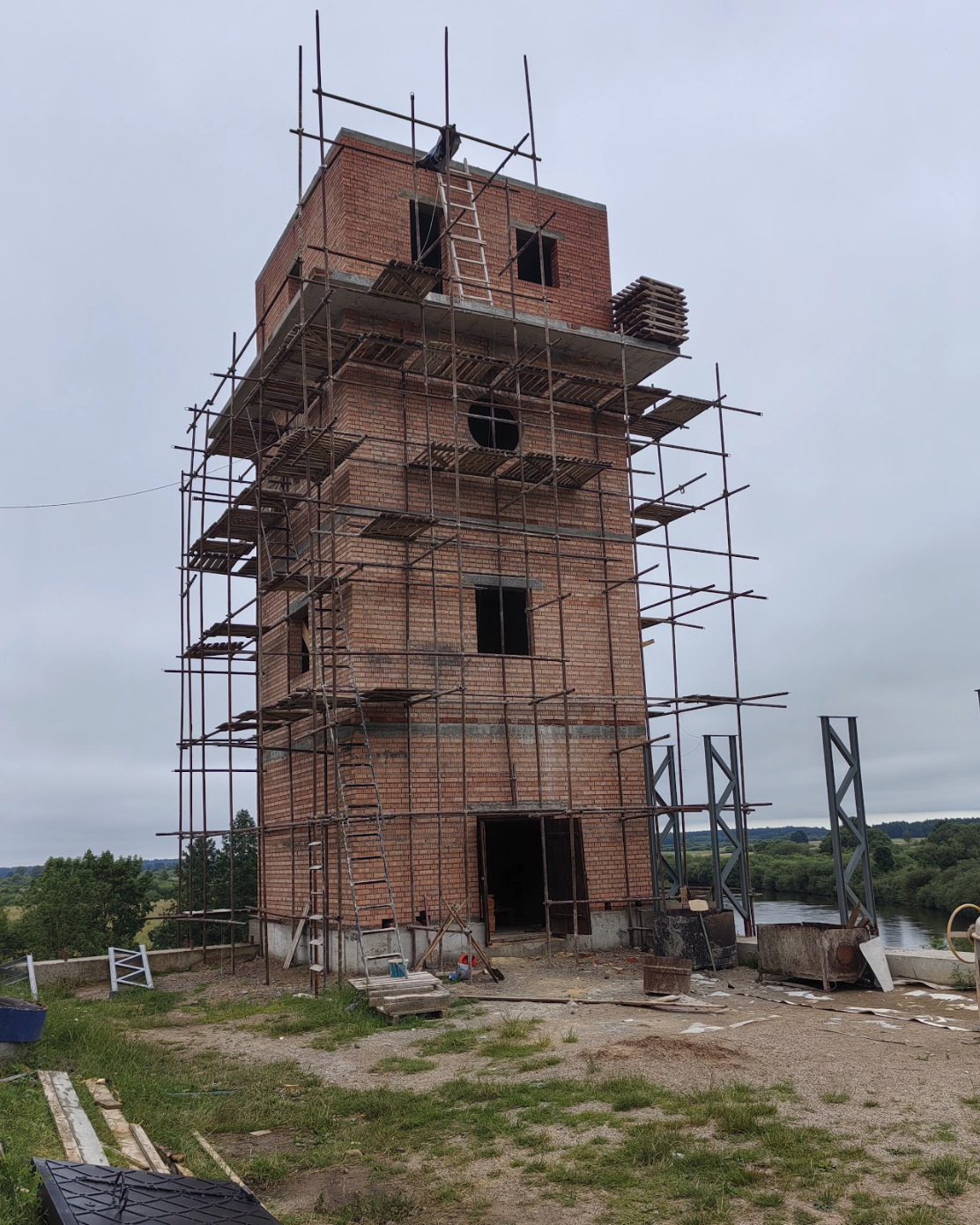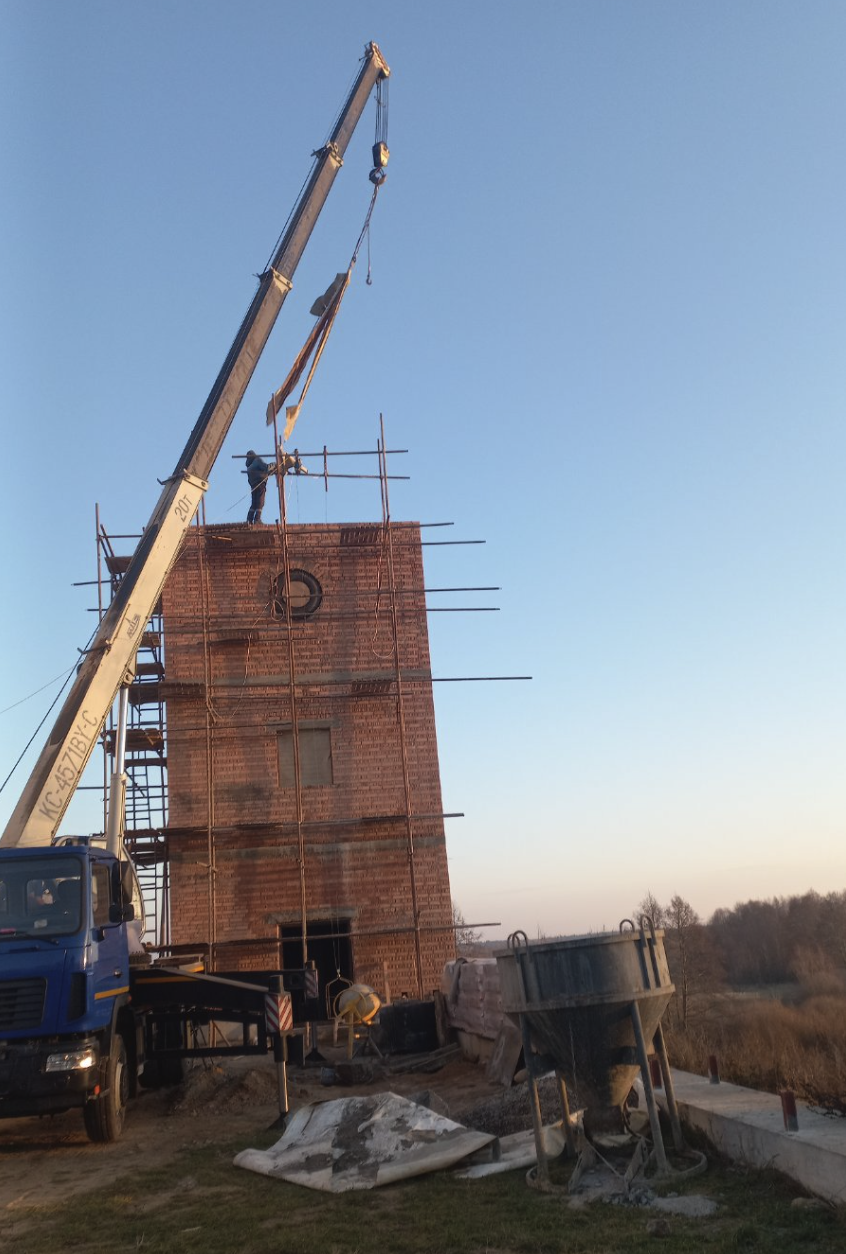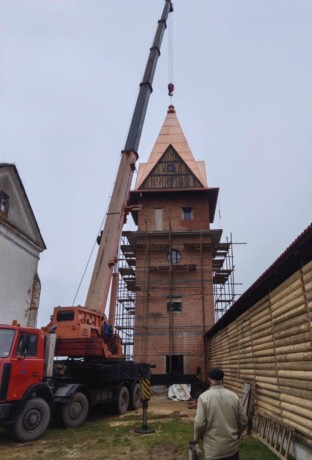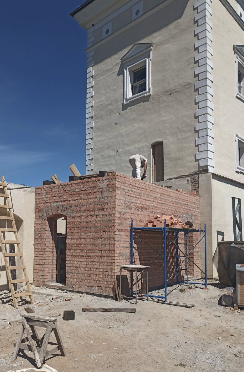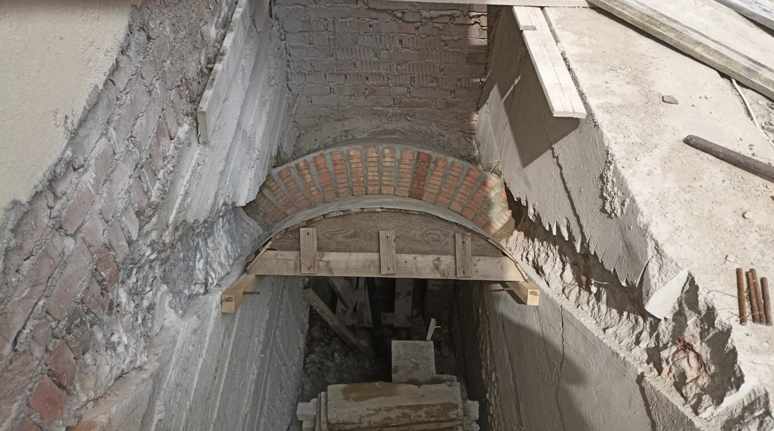 Выполнены лекала и опалубка лесов, изготовлен арочный кирпичный свод, искользовато 3000 кирпича, вес арки более 17 тонн. Снята удерживающая конструкция опалубки лесов. Лекала и подшивка легко снимется в 2023 г. Аналогичный свод нами выполнен в подвальном помещении этой башни в 2020 г.