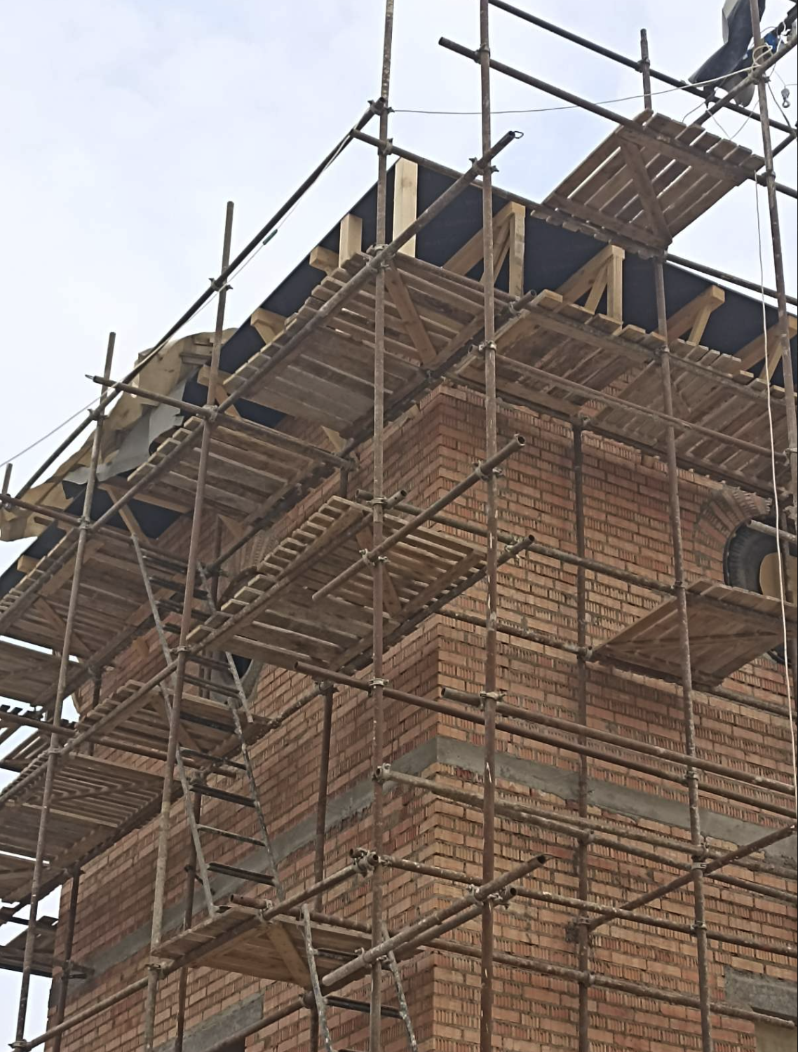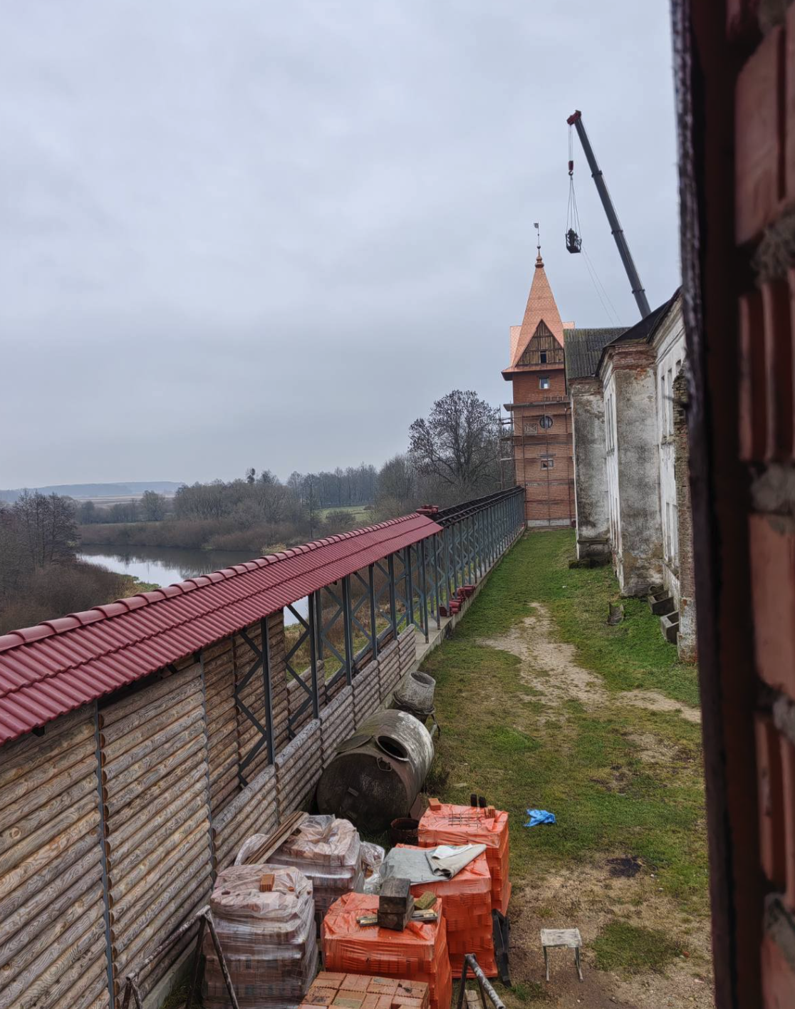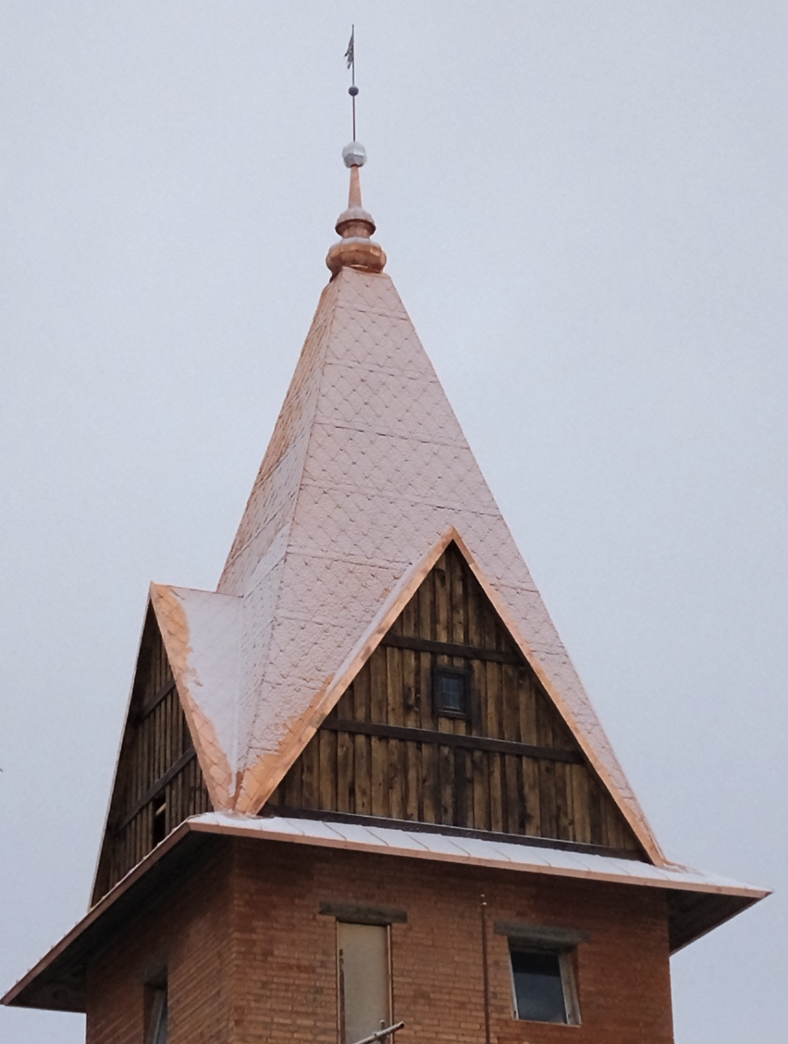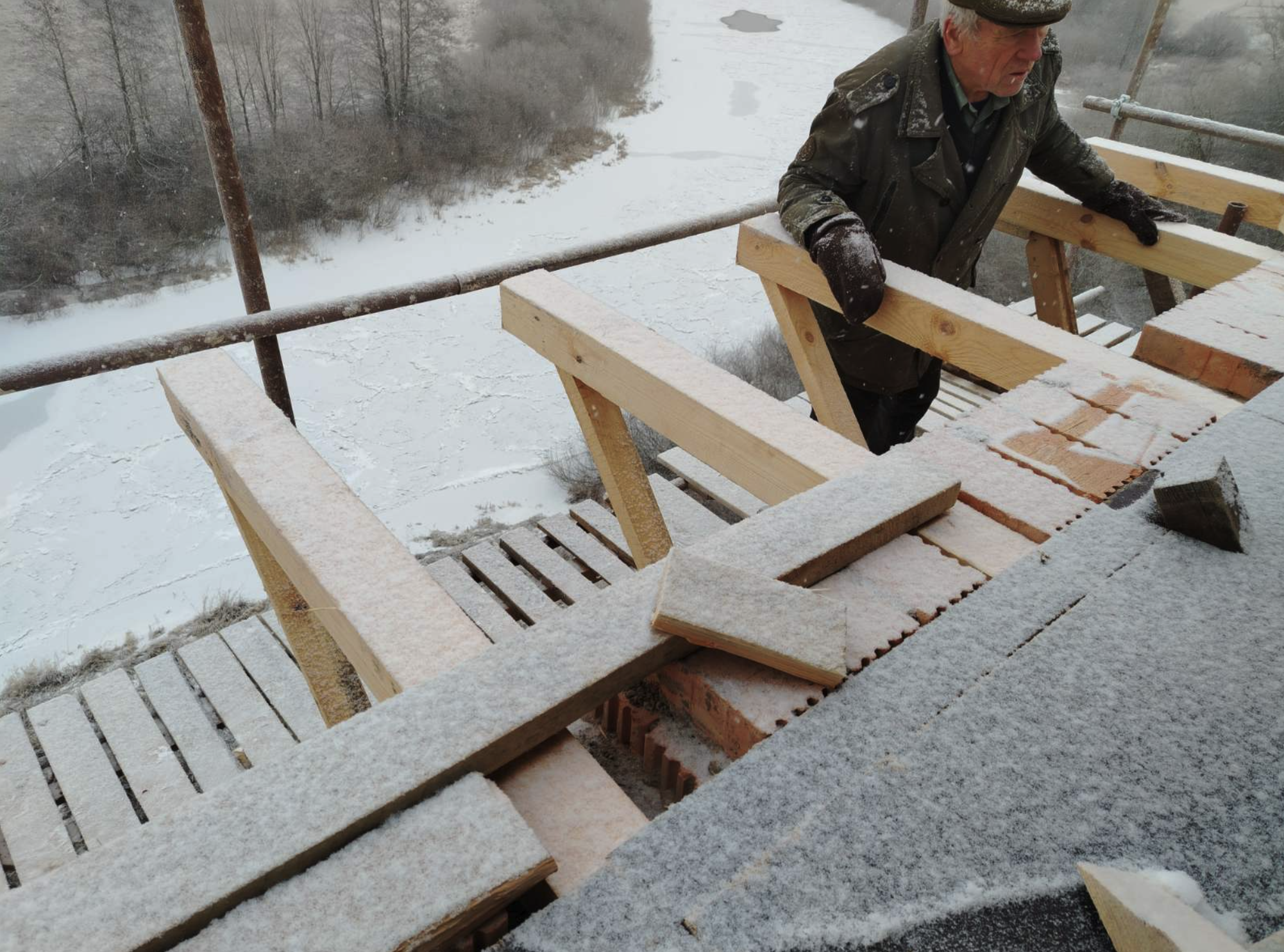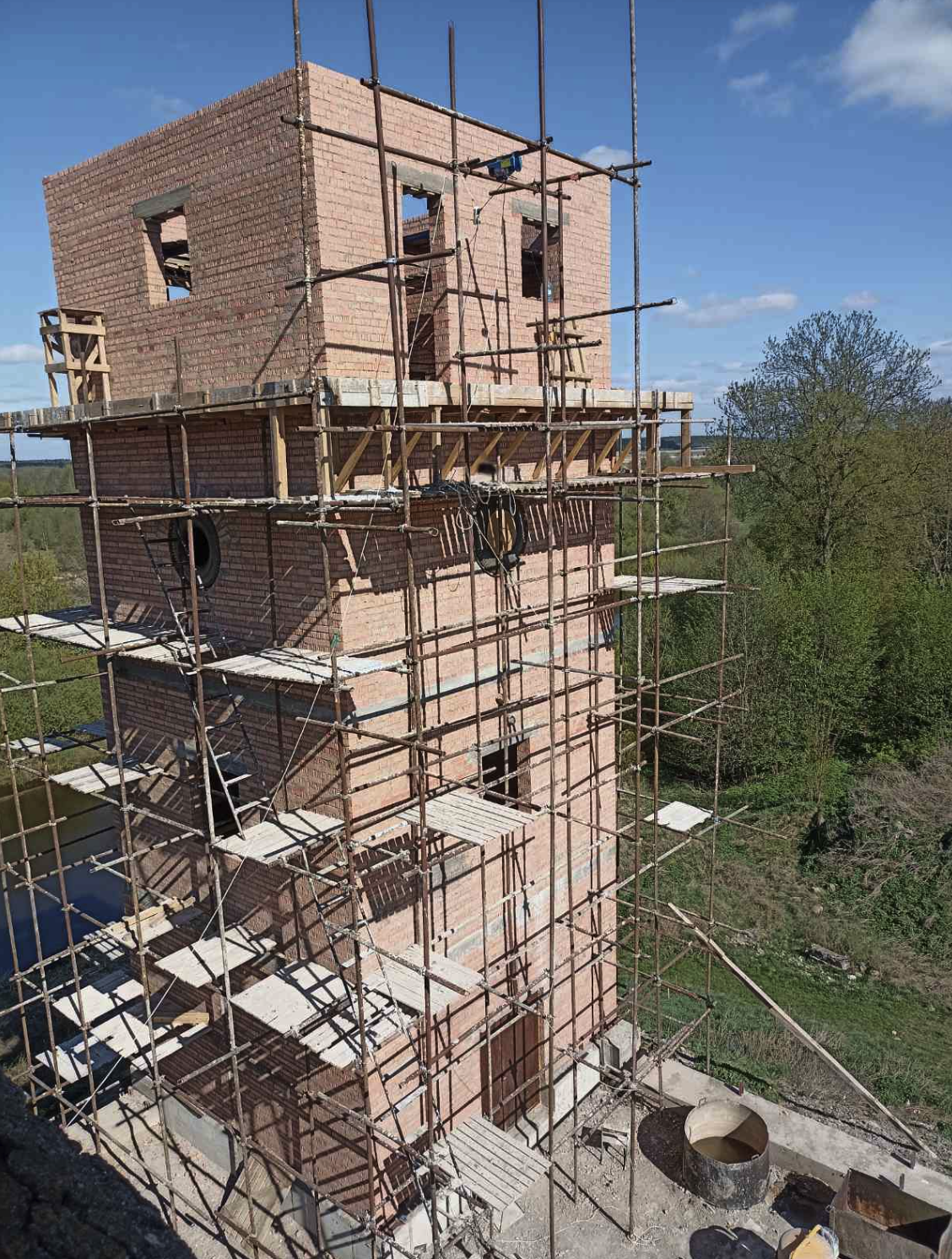Выполнены лекала и опалубка лесов, изготовлен арочный кирпичный свод, искользовато 3000 кирпича, вес арки более 17 тонн. Снята удерживающая конструкция опалубки лесов. Лекала и подшивка легко снимется в 2023 г. Аналогичный свод нами выполнен в подвальном помещении этой башни в 2020 г.