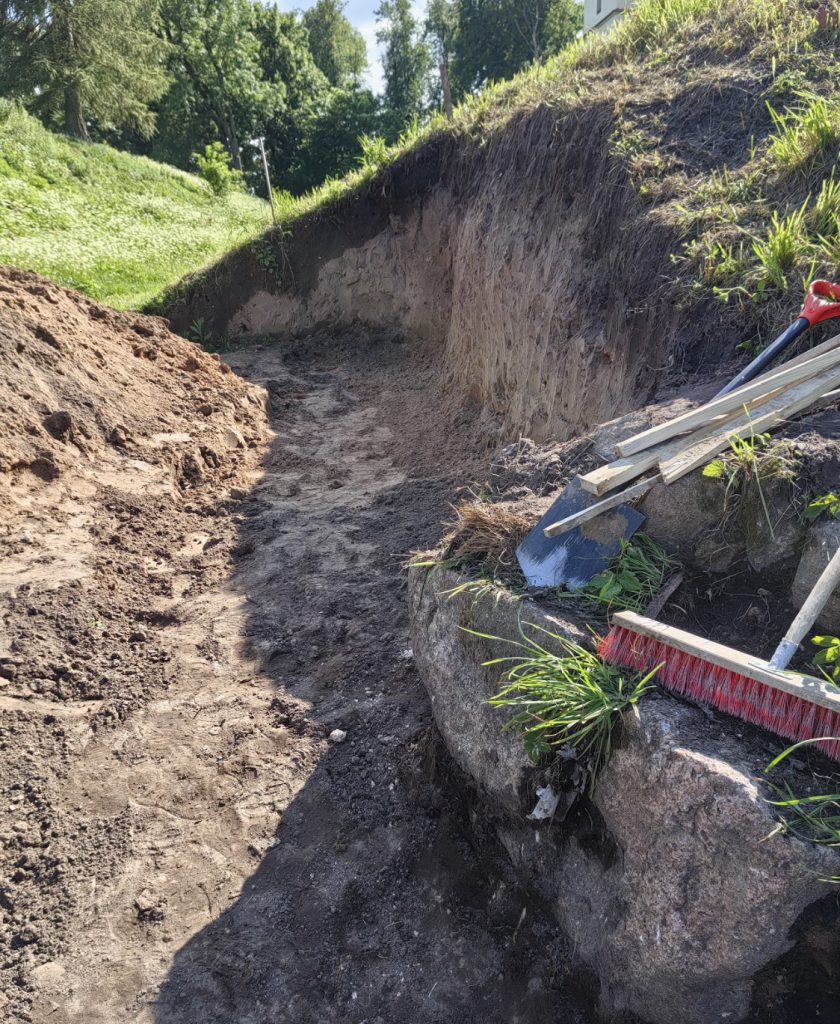 Продолжен ремонт подпорной стены от реки Неман. Всего отремонтировано 77 от её длины 105 метров. В 2022 году выполнено 17 метров, самые сложные по объёму земляных работ.