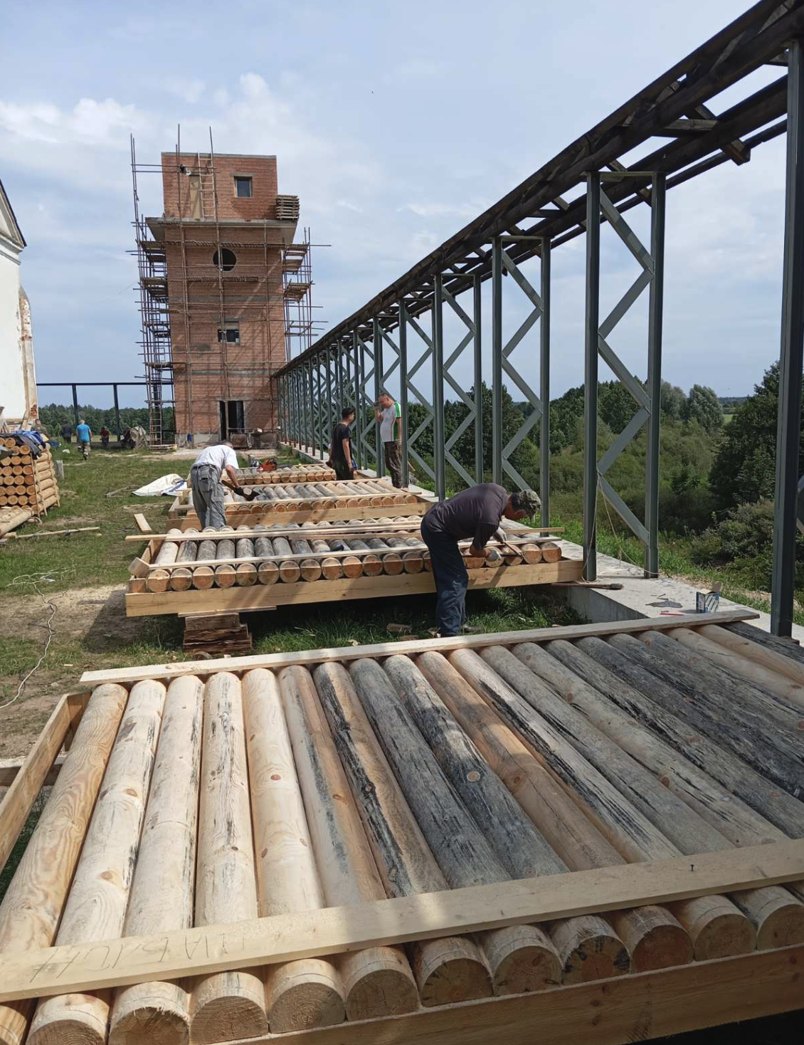 Северная башня с новой секционной временной кровлей, балками пола второго этажа, арматурный пояс усиления.