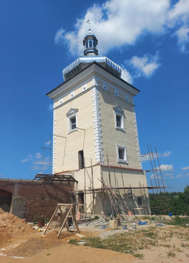 Выполнены лекала и опалубка лесов, изготовлен арочный кирпичный свод, искользовато 3000 кирпича, вес арки более 17 тонн. Снята удерживающая конструкция опалубки лесов. Лекала и подшивка легко снимется в 2023 г. Аналогичный свод нами выполнен в подвальном помещении этой башни в 2020 г.